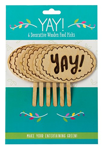 - 6-Count decorative wooden food picks, one side reads: Yay!