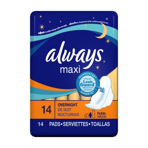 Studio : Always Publisher : Always Binding : Health and Beauty Product Description Always Maxi Pads have our patented Dri-Weave topsheet which is made up of one-way, cone-shaped holes that quickly pull wetness into the absorbent core, away from your body. Also, Maxis have channels to help keep fluid along the center of the pad. And Always Maxis are individually wrapped, so you can conveniently take them wherever you go. Maxi Overnight Pads are longer than Maxi Regular Pads, to provide added protection, and are designed especially for when you are lying down. Always Flexi-Wings help the pad stay in place, even when you turn while you sleep. For heavy to extra heavy protection. 14 pads per package. 0