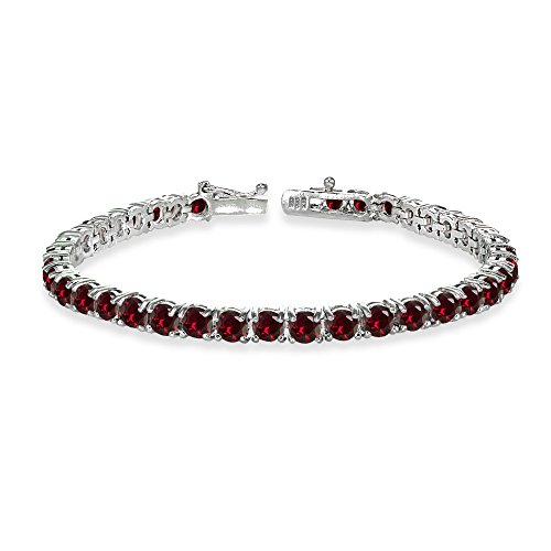 This bracelet displays sparkling round-cut 4mm gemstones, prong set into a line tennis style. The bracelet is created of 925 sterling silver and is tarnish resistant plus nickel free. It secures with a box and tongue plus a safety latch.