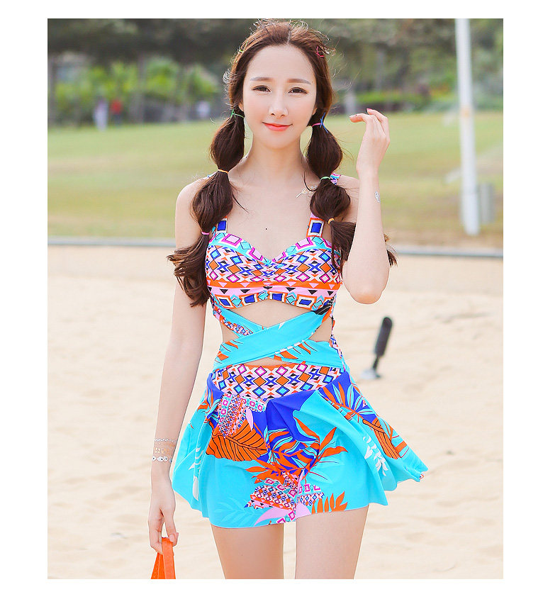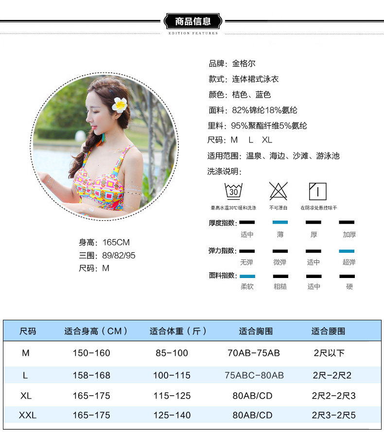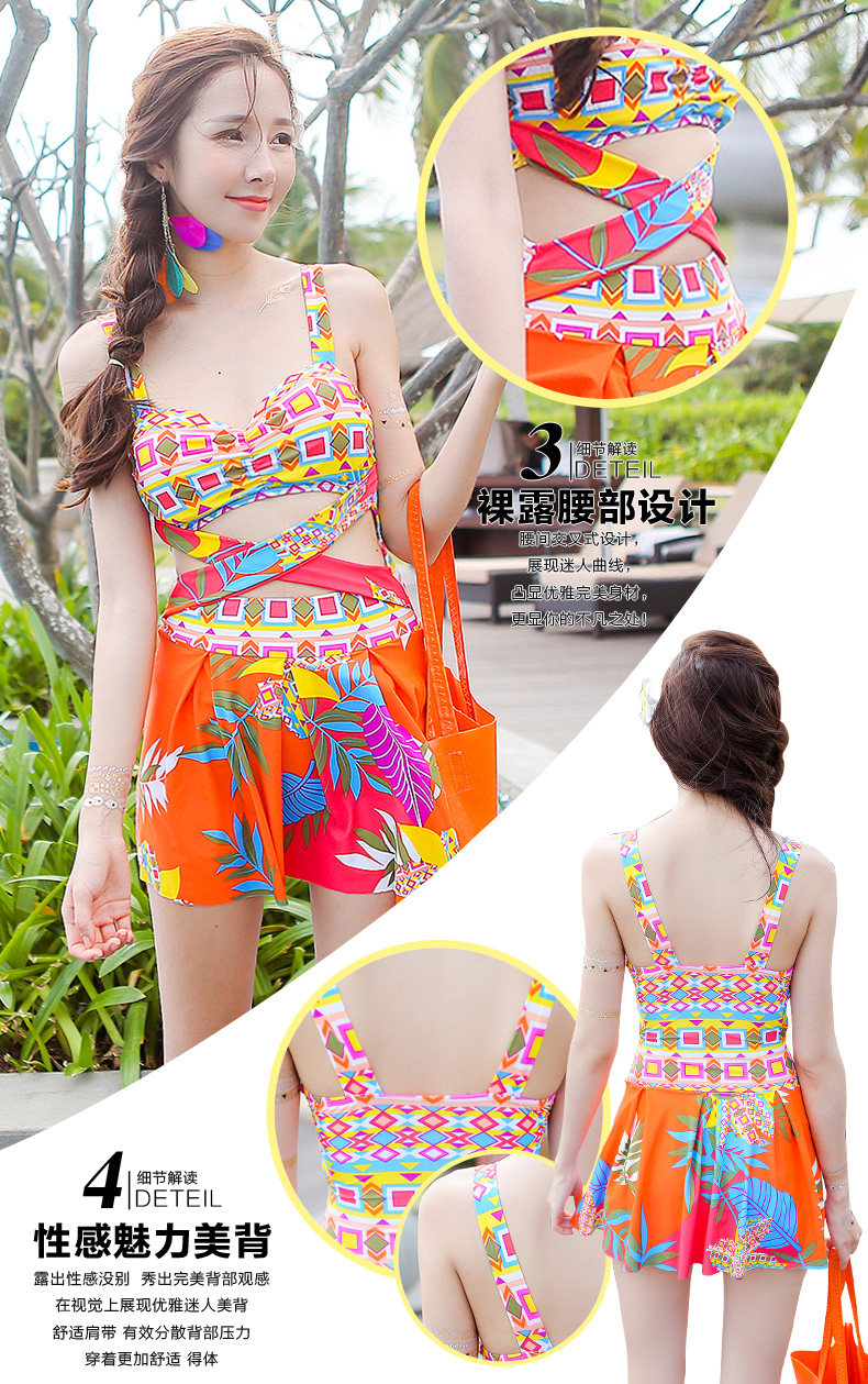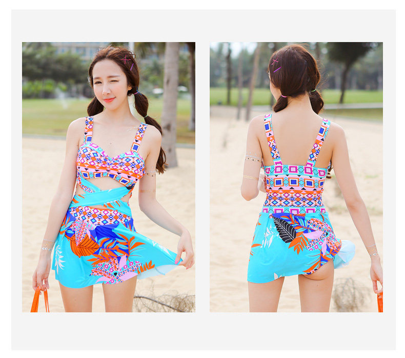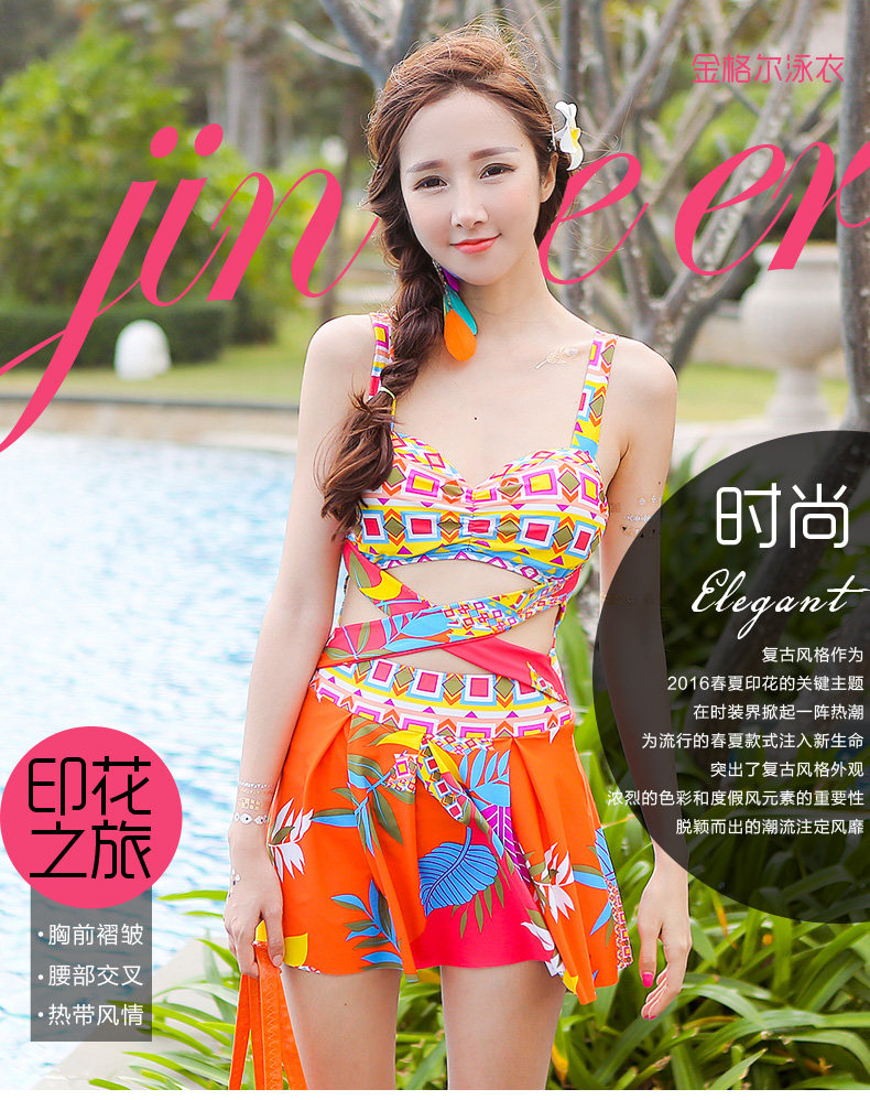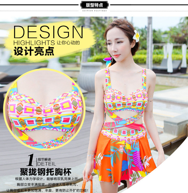裙式三角连体新款泳衣 时尚性感钢托聚拢修身显瘦保守印花游泳衣