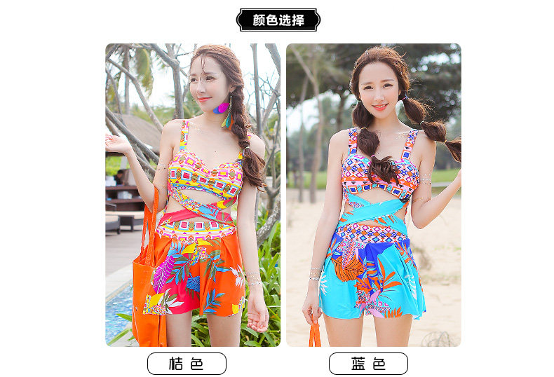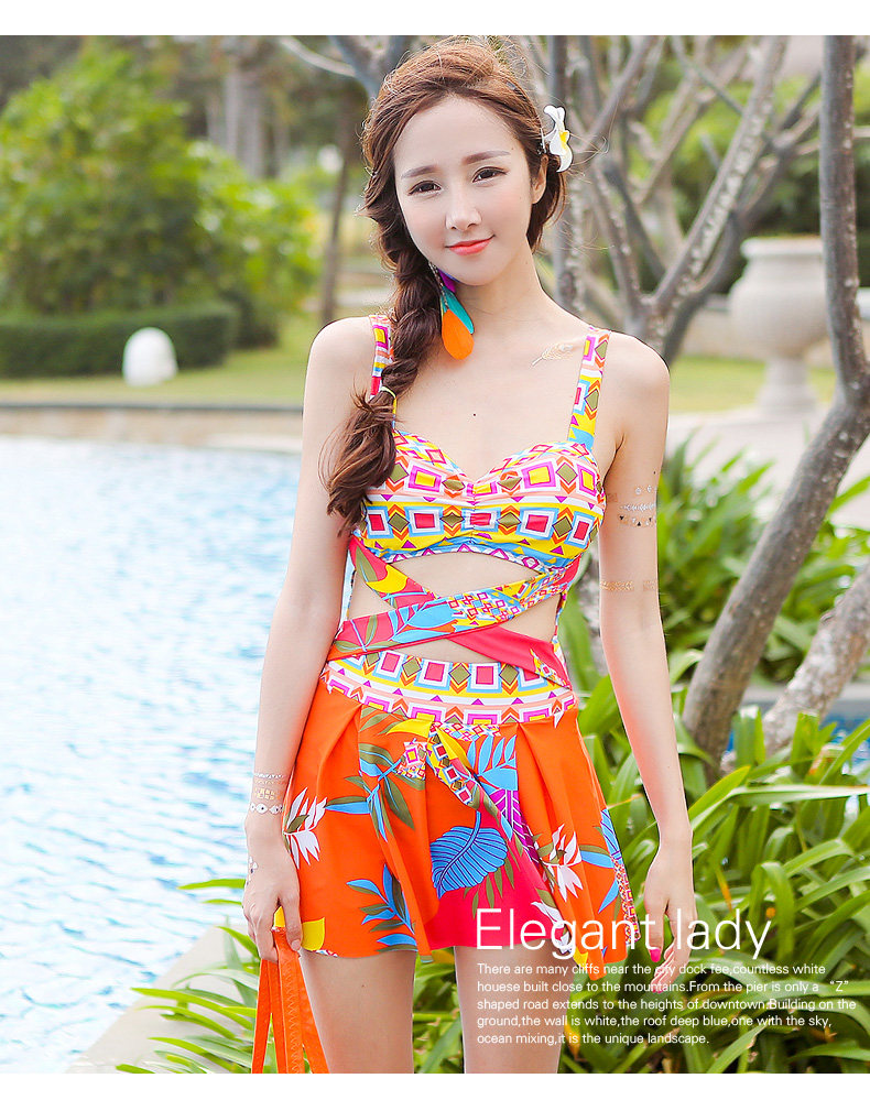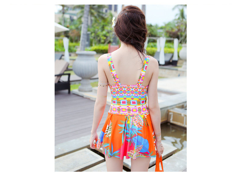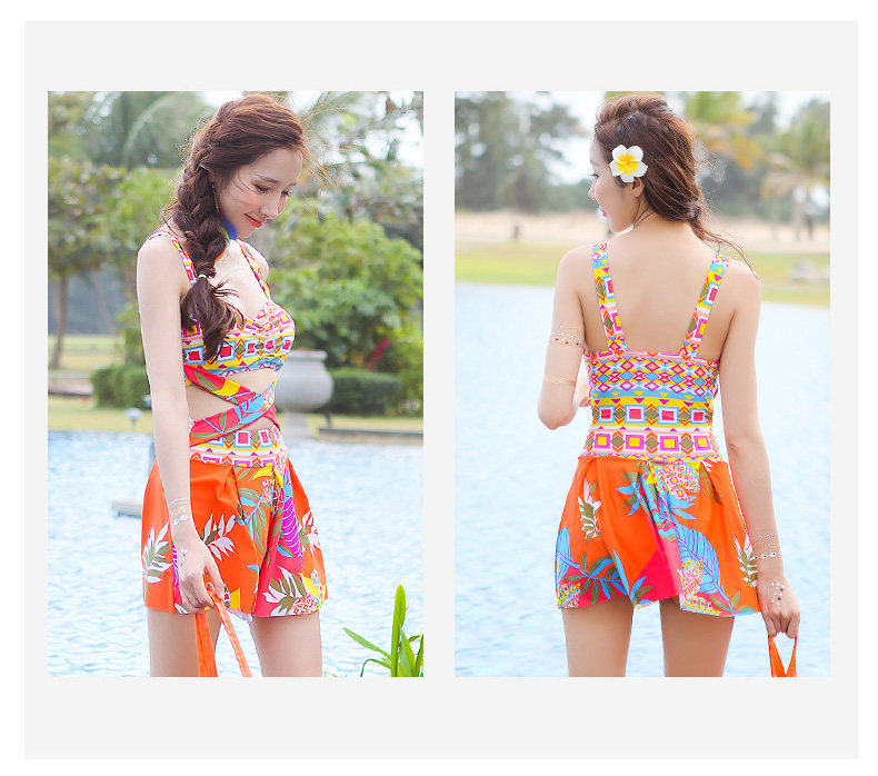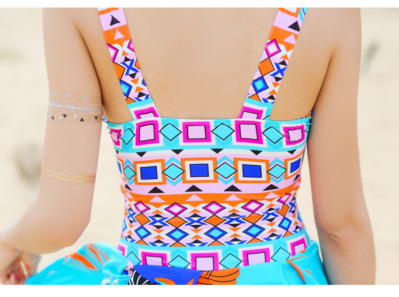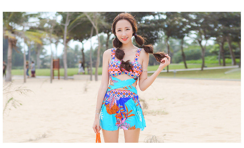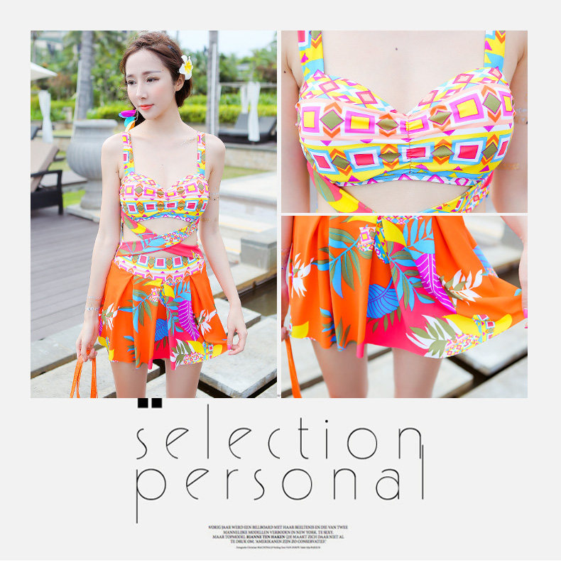 裙式三角连体新款泳衣 时尚性感钢托聚拢修身显瘦保守印花游泳衣