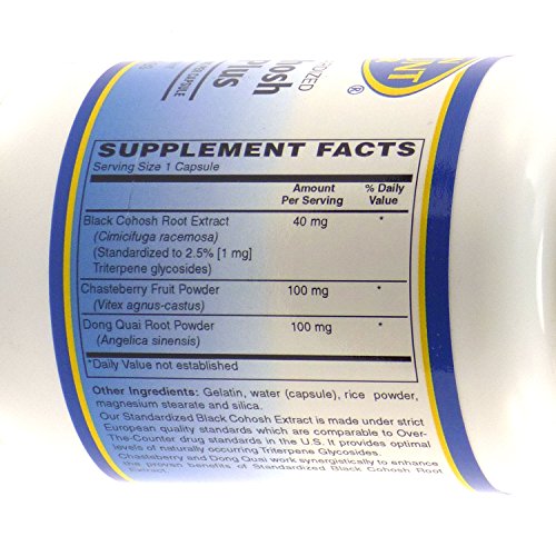 Studio : Vitamin Discount Center Publisher : Vitamin Discount Center Product Description Our standardized Black Cohosh Extract is made under strict European quality standards which are comparable to Over-The-Counter drug standards in the US. It provides optimal levels of naturally occurring Triterpene Glycosides. Chasteberry and Dong Quai work synergistically to enhance the proven benefits of standardized Black Cohosh root extract. As a dietary supplement, adults take one (1) capsule, four (4) times daily with meals, or as directed by a health care professional. Store in a cool, dry place and away from direct light. These statements have not been evaluated by the Food and Drug Administration. This product is not intended to diagnose, treat, cure, or prevent any disease. 0
