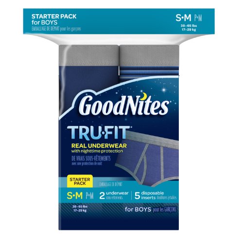 TRU-FIT bedwetting underwear is available in S-M for 38-65 lbs boys, and L-XL for 60-100 lbs boys.