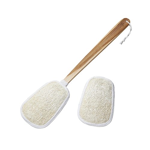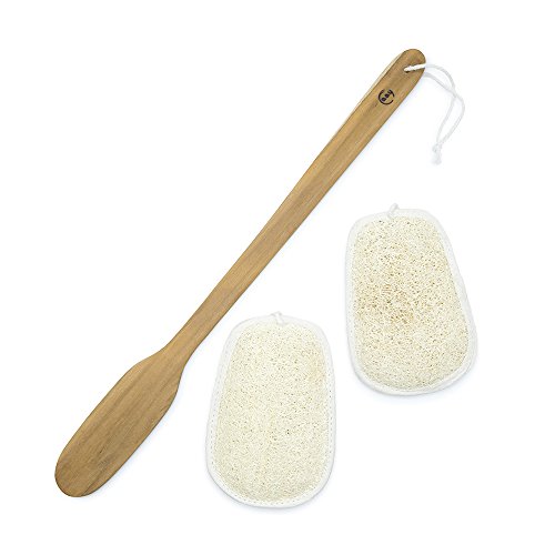 Loofah Back Scrubber on a Stick with 2 Natural Loofah Sponge Pads. 17 inch Long Handle of Genuine Teakwood for Women & Men. Excellent Exfoliating, Relief...