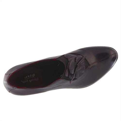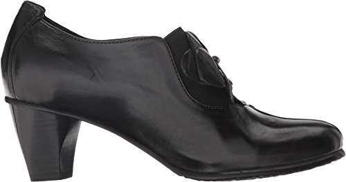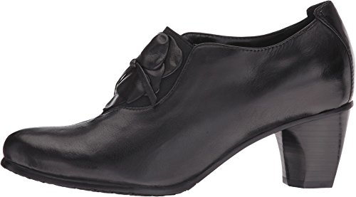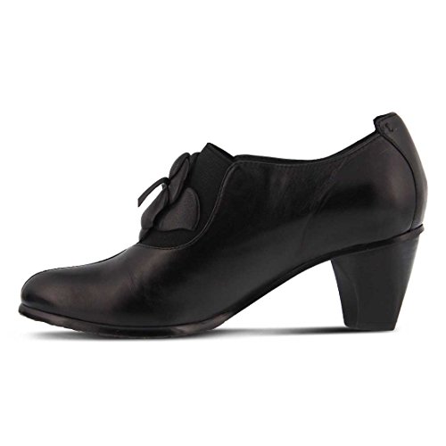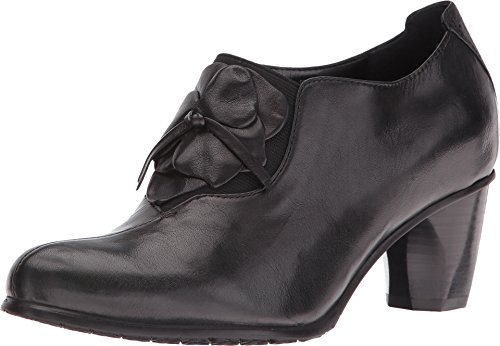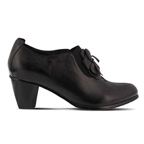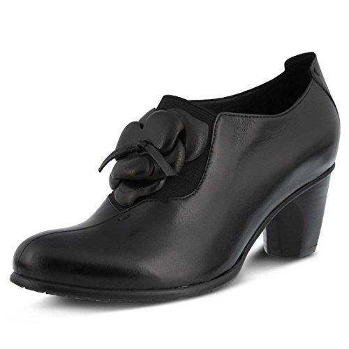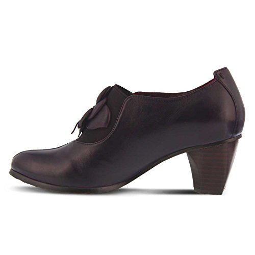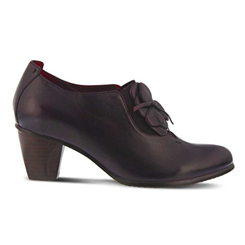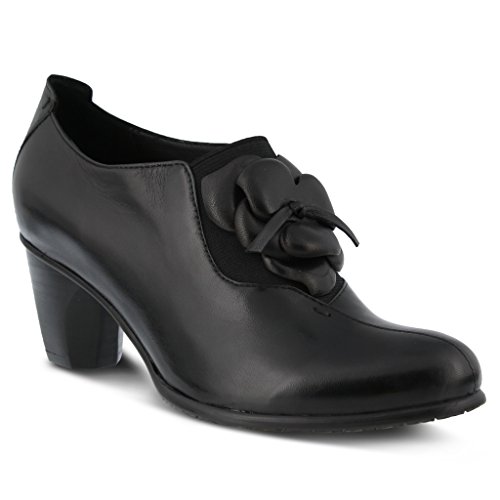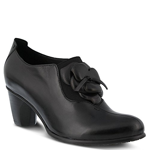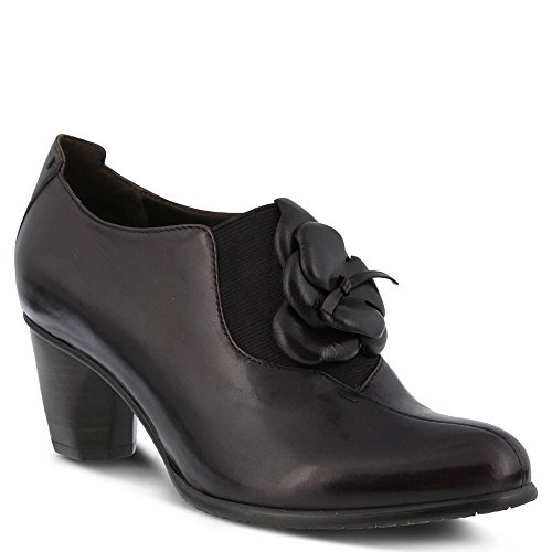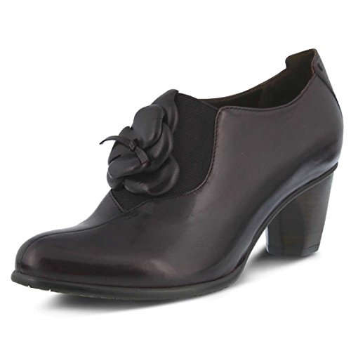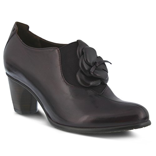 Product DescriptionFeminine polished leather heeled slip-on fashioned with a polished leather flower and unique heel.0