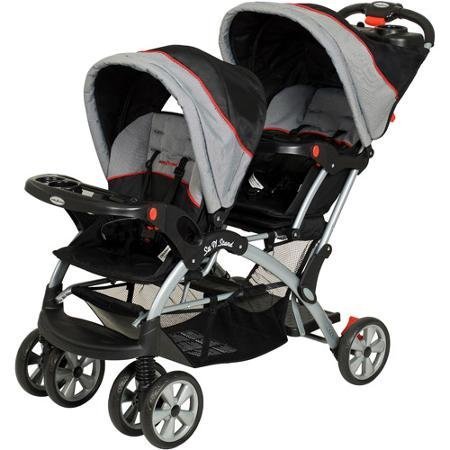 -. Feature : Accommodates 2 Baby Trend infant car seats Front Seat recommended use: UP.R.Ight, unassisted child up to 40 lbs. / Back Seat recommended use: 2 1/2 years up to 40 lbs. Covered parent-organizer with 2 cup holders / 2 trays with cup holders 5-point safety harnesses / Sit N Stand Plus Double Baby Stroller features 2 full-size seats and canopies / Stroller's rear canopy and seat back can be removed to allow older children to stand or sit Assembly required