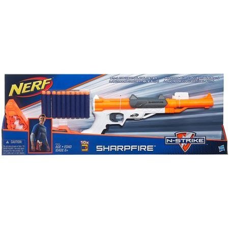-. Binding : Toy -. Brand : Nerf -. Color : Multi-Color -. EAN : 0718645504356 -. Feature : SharpFire blaster is a 6-in-1 convertible blaster Configure it 6 ways with the removable stock and barrel extension / Blaster converts to a holster Store up to 6 darts on the blaster / Includes 10 darts WARNING: CHOKING HAZARD - Small parts will be generated. Not for children under 3 years. / CAUTION: Do not aim at eyes or face. / TO AVOID INJURY: Use only darts designed for this product. Do not modify darts or dart blaster. -. IsAdultProduct : 0 -. Label : Nerf -. Manufacturer : Nerf -. ProductGroup : Toy -. ProductTypeName : TOYS_AND_GAMES -. Publisher : Nerf -. Studio : Nerf -. Title : Nerf N-Strike Sharp Fire Blaster Incredibly Versatile Blaster is a 6-in-1 Powerhouse -. UPC : 718645504356