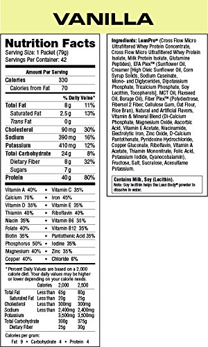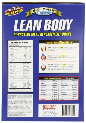 -. Binding : Health and Beauty -. Brand : Labrada -. EAN : 0710779120051 -. Feature : Incredible Taste! Lean Body is the best tasting meal replacement powder (MRP) ever made. That's why the American Culinary Institute awarded Lean Body its Gold Medal Taste Award for five years in a row. / 40g of LeanProT proprietary blend of fast-release and slow-release proteins, to give you a sustained flow of vital amino acids. / Over 8,000 mg of Glutamine & Glutamic Acid. Studies show that supplemental gluatamine can also prevent muscle breakdown. / 24 grams of an advanced blend of high-fiber carbohydrates to help stabilize your blood sugar and insulin levels, to promote greater energy and fat burning. -. Label : Labrada Nutrition -. Manufacturer : Labrada Nutrition -. Model : LB64 -. MPN : LB64 -. NumberOfItems : 1 -. PackageQuantity : 42 -. PartNumber : LB64 -. ProductGroup : Health and Beauty -. ProductTypeName : HEALTH_PERSONAL_CARE -. PublicationDate : 2010-03-10 -. Publisher : Labrada Nutrition -. Studio : Labrada Nutrition -. Title : Labrada Nutrition Lean Body Meal Replacement Shake, Vanilla Ice Cream, 2.78-Ounce Packets (Pack of 42) -. UPC : 710779120051