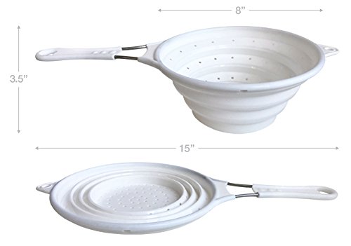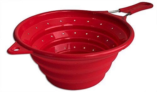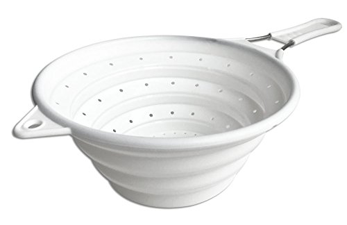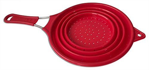 Chef Basic's space saving Collapsible Colander quickly expands holding its shape to clean fruit, vegetables, pasta, etc., and once you're done, it collapses flat to easily fit in a drawer. This essential kitchen tool is made from stain-resistant silicone, and features a single easy-grip handle with a hole for hanging. It's BPA-free, dishwasher-safe, and can withstand a temperature range from below 0 to over 400 degrees Fahrenheit.Feature