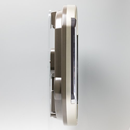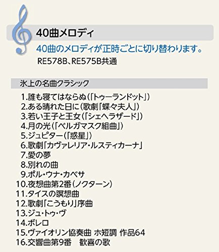 -. Feature : 本体サイズ:46.5×33.7×9.9cm / 素材・材質:プラスチック枠(薄金色パール塗装)、前面:ガラス / 原産国:タイ / ムーブメント:電波修正機能(40kHz/60kHz自動選局・受信OFF機能つき) / 付属品:単2(アルカリ)×4(電池寿命約1年間) / 正時パフォーマンス&40曲メロディ(メロディーは正時ごとに切り替わります)、光センサーによる自動鳴止め / 音量調節、報時モニター、回転飾り(スワロフスキー®クリスタル) / 石膏ボード用掛金具つき、スイープセコンド、おやすみ秒針(光センサーによる自動秒針停止機能)