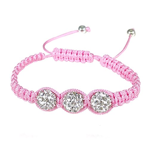 A simple yet charming piece of jewelry, this shamballa inspired bracelet will dazzle on your little one! The bracelet features three beads studded with rhinestone crystals. The bracelet is adjustable and can fit the hand of a young child.Feature