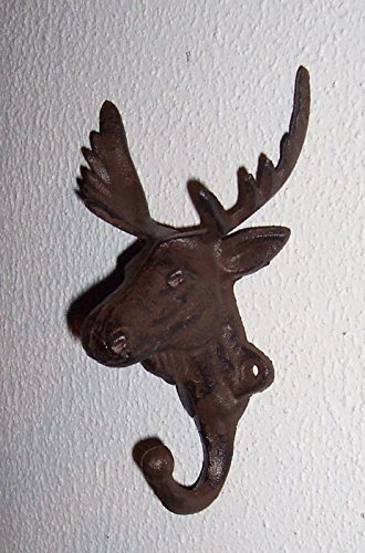 -. Feature : Wall hung hanger hook - Moose head antique style - Indoor or outdoor use - Good for farm house ,cottage, lake house, bunglow, home ,and office / Made of heavy cast iron - Rustic dark bronze finish - Hange hook on the bottom of the neck hanger hook / Hanger measures approximately: 4-7/8 in wide x 2 3/4 in deep x 6-1/2 in tall - Hangs by two screws - Not included / Use for hanging coat and hat, keys, jewelry, candles, robe, towel, wall decoration and more - New, ever been used / Note: To see cast iron low price products +++ Search on Amazon: ABC Products Cast Iron