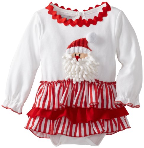 Cotton long sleeve crawler with printed poplin ruffles and Santa face applique with chenille shag beard. Christmas red grosgrain ribbon accents complete the look.Feature