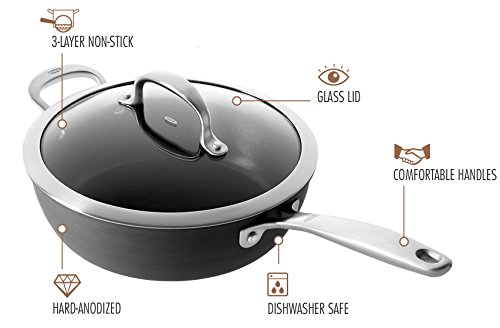 The OXO Good Grips Non-Stick Pro Cookware line features effortless food release and overall superior performance. Each piece offers a thoughtful design, from heavy-gauge anodized aluminum and stay-cool stainless steel handles to drip-free pouring edges and a dishwasher safe coating. The German-engineered, PFOA-free, 3-Layer Non-Stick coating allows for effortless food release with minimal oil or butter, and the durable, scratch-resistant, Hard-Adonized Aluminum construction ensures superior heat conduction and even cooking. Angled side walls help liquids evaporate quickly and rounded bottoms facilitate efficient stirring, and clear, tempered glass lids make it easy to check the progress of your dish without lifting the lid. The contoured, comfortable handles stay cool to the touch and are riveted to provide a secure grip. The durable, all-metal construction is perfect for all stovetops, except induction, and can move directly from the stovetop to oven (oven-safe up to 430 Degree Fahrenheit/220 Degree Celsius). The Non-Stick Pro Cookware line is dishwasher safe for quick and easy cleanup. The 3 Quart Covered Saucepan features a helper handle for easy carrying and is ideal for soups, sauces, caramel and a multitude of everyday cooking tasks.Feature