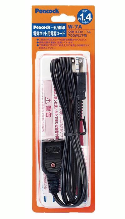Peacockの全機種の電気ポットでご使用いただける、マグネット式電源コードです。 製造国:中国 商品サイズ:長さ:約1.4m 仕様:電圧:100V 7A ※サプライヤー直送品 ご注文後3~4営業日後の出荷となります【商品名】Peacock ピーコック 電気ポット用 電源コード W-7A