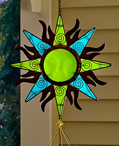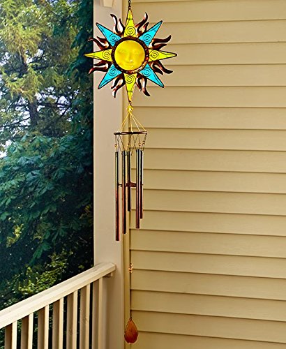 - Sun face Glow-in-the-Dark feature an eye-catching sun with alternating blue and yellow rays that glow in the dark. Sun Face Wind Chime, 11-1/2"W x 5"D x 42-1/2"H. Metal and glass.
