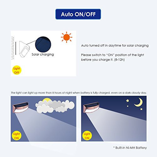 - 【EASY TO INSTALL】 No wiring is required to install this solar powered security light. Simply install the solar light under the sunlight without any shade; Switch to “ON” position of the light before you charge it and will be fully charged around 8 hours