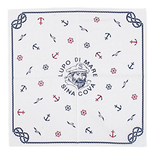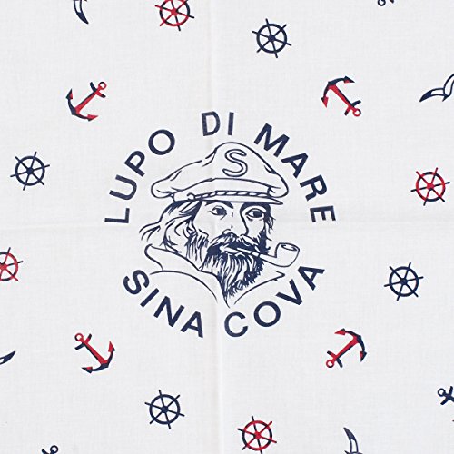 Binding : Apparel Product Description SINA COVA is a luxury casual sailing clothing brand that was born in Italy and raised in Japan.This bandana, which has anchors, steering wheels, and seagull motifs within a juxtaposition pattern of ropework, with a drawing of CAPTAIN SINACOVA in its center, represents sailing. 0