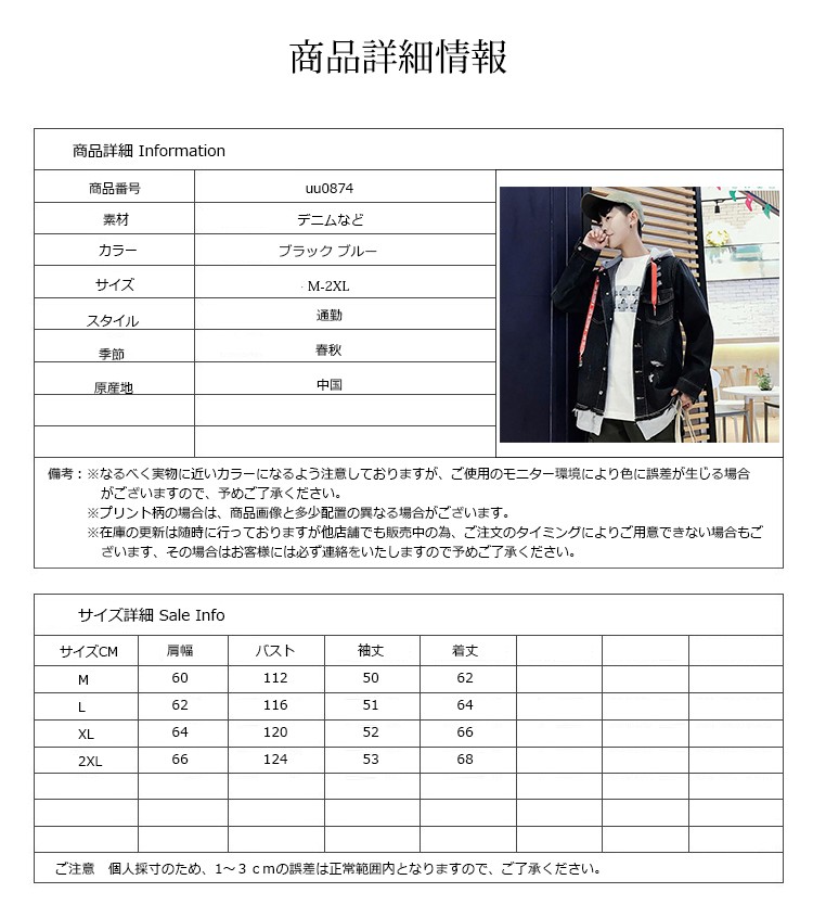 ■素材:デニムなど■カラー:ブルー ブラック■サイズ:M着丈62バスト112肩幅60袖丈50L着丈64バスト116肩幅62袖丈51XL着丈66バスト120肩幅64袖丈522XL着丈68バスト124肩幅66袖丈53■原産地:中国