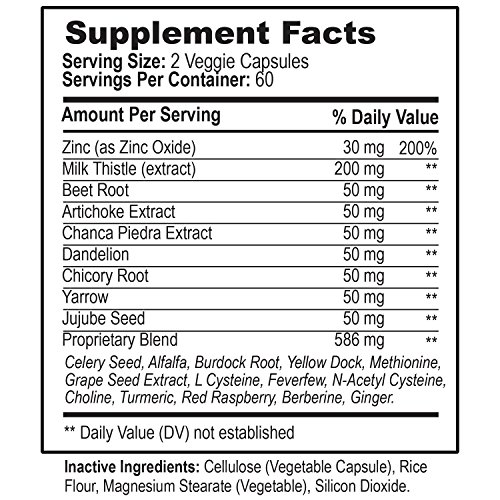 Supplement Facts (per 2 Veggie Capsules): Zinc (as Zinc Oxide) - 30 mg Milk Thistle (extract) - 200 mg Beet Root - 50 mg Artichoke Extract - 50 mg Chanca Piedra Extract - 50 mg Dandelion - 50 mg Chicory Root - 50 mg Yarrow - 50 mg Jujube Seed - 50 mg Proprietary Blend - 586 mg (Celery Seed, Alfalfa, Burdock Root, Yellow Dock, Methionine, Grape Seed Extract, L Cysteine, Feverfew, N-Acetyl Cysteine, Choline, Turmeric, Red Raspberry, Berberine, Ginger.)