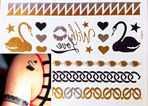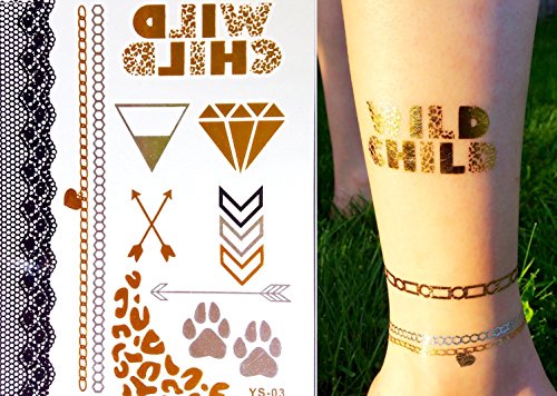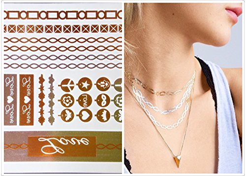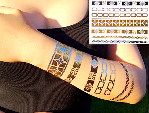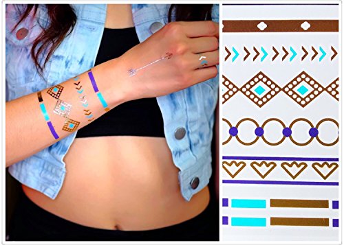 Premium Temporary Tattoos 5 Sheets | Metallic Gold, Silver, Turquoise Flash Tattoos for Women & Girls | Over 80+ Tattoos | 1 Sheet for Bonus Nail Sticker
