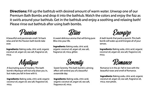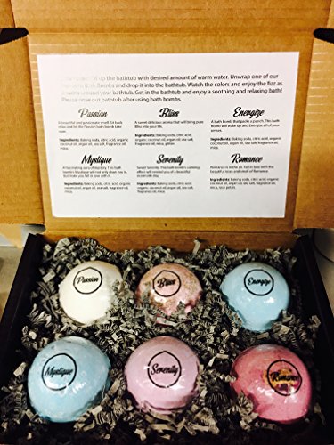 -. Feature : DOUBLE THE NORMAL SIZE & AMAZING AROMA. This Gift Set Contains Six (6) 4.5 oz Luxurious Bath Bombs (Tennis Ball Size) Which is Twice the Size of the Most Competitors 2.1 oz (Golf Ball Size). Six Unique Fragrances: PASSION, BLISS, ENERGIZE, MYSTIQUE, SERENITY & ROMANCE. Our Bath Bombs Offer a Relaxing & Invigorating Tingling of Your Senses with Unique Fragrances and Vibrant Colors for Every Occasion. / WON'T STAIN YOUR TUB. Made with Natural Ingredients that Will Not Stain. Our Bath Bombs Create the Most Dynamic Colors and Fizz in Your Tub. They Won't Just Sink to the Bottom Like Most Others. Watch them Spin and Float While Creating the Most Luxurious Bath Experience. / FRESHLY HANDCRAFTED IN THE USA. These Therapeutic and Moisturizing Bath Bombs Offer a Relaxing Spa Type Treatment and are Formulated for Normal to Dry Skin. Your Skin Will Feel Hydrated and Moisturized. / PERFECT GIFT FOR ALL OCCASIONS. Individually Shrink Wrapped to Protect & Keep Your Bath Bombs Fresh. Perfect for Party Favors, Graduation Gifts, Mother's Day, Birthday, Wedding Gifts, Bar Mitzvah's, Girls Night, Valentines Day, Christmas Gifts, Spa and Bath Gifts. Great for Women, Teenagers, Kids of all Ages, Even Boys & Men. / 100% SATISFACTION GUARANTEE. If You Aren't Completely Satisfied, We'll Give You Every Penny Back with Our NO QUESTIONS ASKED MONEY BACK GUARANTEE. Try it Today at Our Risk Not Yours.