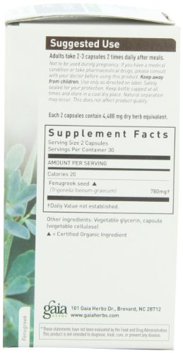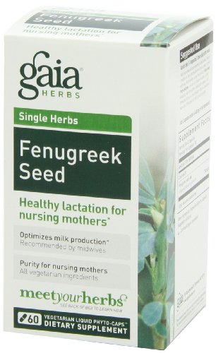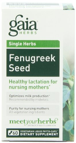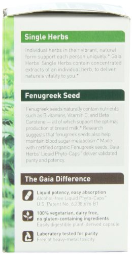 Studio : Gaia Herbs Publisher : Gaia Herbs Binding : Health and Beauty Product Description Gaia Herbs Single Herbs Fenugreek Seed healthy lactation for nursing mothers. Fenugreek seeds contain nutrients such as B vitamins, Vitamin C, and Beta Carotene - all of which support the optimal production of breast milk. Research suggests that fenugreek seeds also help normalize blood sugar metabolism. Made with certified organic Fenugreek seeds, Gaia Herbs' Liquid Phyto-caps deliver guaranteed purity and potency. 0