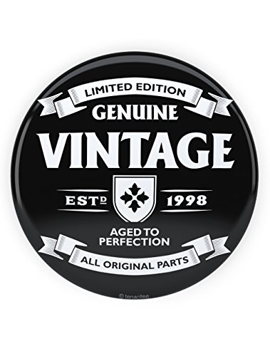 Studio : Tenacitee Publisher : Tenacitee Binding : Apparel Product Description Aged to Perfection - 1998 2.25" Button by Tenacitee. Express yourself! Buttons are the perfect way to let the world know how you feel. Our buttons are designed, printed, and handmade at Tenacitee's studio in Oklahoma. Proudly made here in the USA! This 2.25" button has a metal shell with pinback and mylar cover to protect from scratches. Perfect to decorate your shirt, jacket, bag, or put anywhere else you want! It's a great gift or giveaway for parties. 0