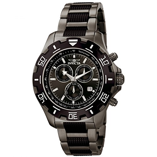 With reliable Swiss quartz movement, the Invicta Men's Python Collection Chronograph Gun Metal Stainless Steel Watch #6412 offers classic chronograph styling with a contemporary aesthetic. An attractive brushed and polished stainless steel gunmetal-tone screw-down case and bracelet is matched with a unidirectional bezel with minute markers on its exterior and tachymeter information on its interior. Ensure that you’re on time when you want to be with Tritnite luminous hands and large gunmetal-tone hour markers set on the attractive black enamel dial. Underneath a durable flame-fusion crystal, a date window at the four o'clock position helps you keep tabs on your busy schedule while chronograph functions with 60 second, 30 minute, and day-of-the-week subdials can be found at the two, six, and 10 o'clock positions. Water resistant to 330 feet (100 meters), this watch features a solid stainless steel gunmetal-tone band with black ionic plated stainless steel inserts closes with a diver's fold-over with safety clasp.Feature