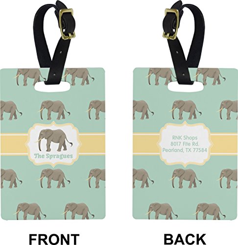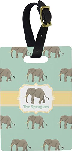 Your bags will be super easy to spot when you decorate them with these rectangular luggage tags. Our variety of fun and beautiful designs will help your luggage stand out from the rest. The rectangular shaped tags have the design on both sides and very durable. They also include a leather strap with buckle to secure onto luggage handles. About the Design An elephant never forgets, and we hope you won't forget this Elephant design. The design shows gray, tusked elephants on a mint background with a light yellow ribbons. The center has a label with an elephant and a space for text. Although shown in mint and yellow, the background and label color can be changed. Add a personal touch with a name or other text. Features: - Durable