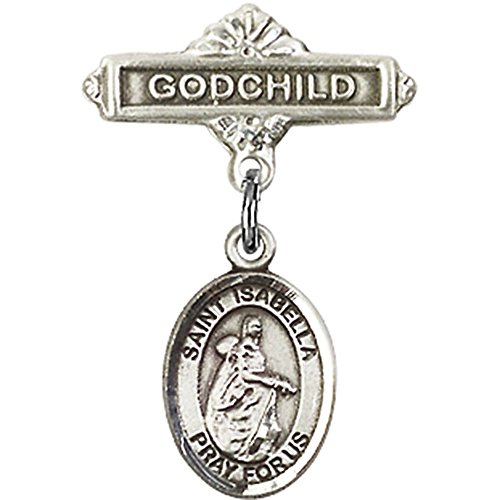 -. Title : Sterling Silver Baby Badge with St. Isabella of Portugal Charm and Godchild Badge Pin 1 X 5/8 inches