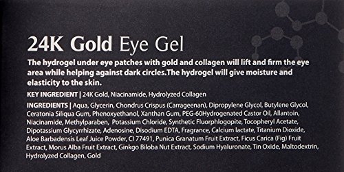 The hydrogel under eye patches with gold and collagen will lift and firm the eye area while helping against dark circles. The hydrogel will give moisture and elasticity to the skin.