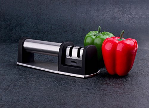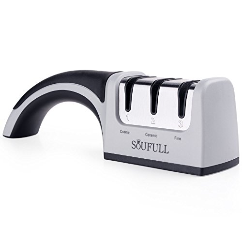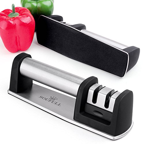 【Non-slip Base& Easy to Use 】 Soufull knife sharpener designed the non-slip base to keep your safety while other sharpener didn't. There are 2 stages for your dull knifes, COARSE is suitable for sharping knife and FINE is suitable for polishing your blades to razor-sharpness.