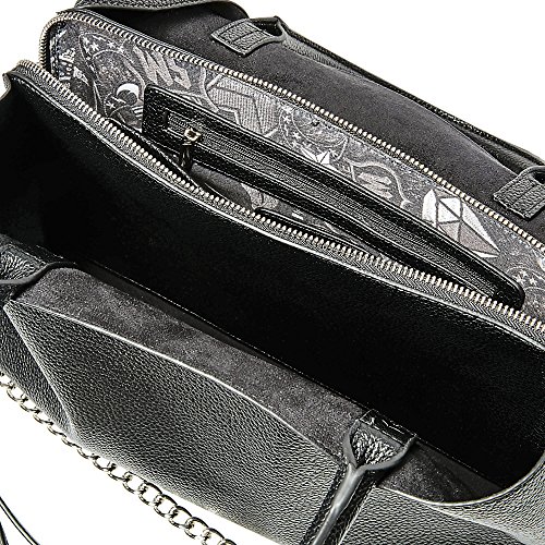 -. Feature : Top handle and detachable partial chain strap / Silver tone hardware / Man-made materials / Three interior compartments / Zippered pocket in center divider