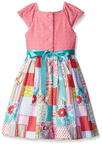 Pink lace bodice to multi colored patchwork printed skirt with ribbon and flower details at waist
