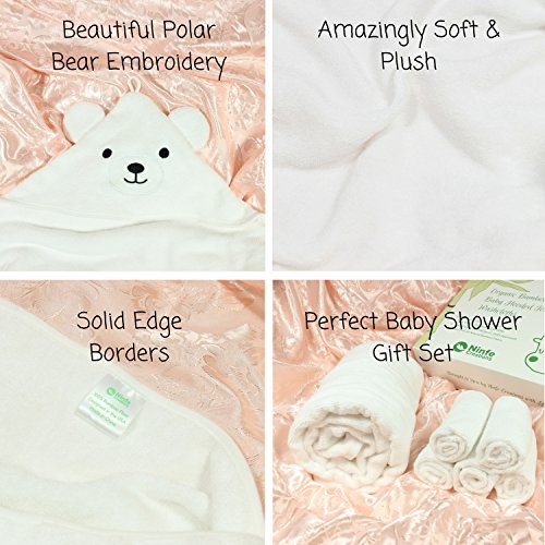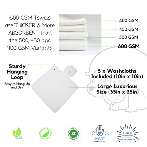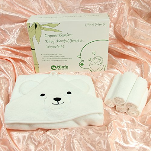 All In One Bamboo Baby Bath Set (6 Pieces) Let your baby experience the best nature has to offer with our organic bamboo hooded towel and washcloths set. Our deluxe set includes a unisex bamboo hooded towel 5 pieces of washcloths all made from organic bamboo. This is the ultimate bamboo indulgence for your baby! Soft and Plush (100% Organic Bamboo) Bamboo is an eco-friendly material that has a much softer and luxurious feel than cotton. When you purchase our product you will receive a detailed PDF guide to the full bamboo experience through our follow-up email. Thicker, More Absorbent Long-Lasting (600 GSM) Our hooded towel measures at 600 GSM which means that it’s much more thicker absorbent than other towels that use lower GSM. It also means that the towel will last much longer than our thinner competitors which will lose thread count after washes. Unique Design (Polar Bear Hanging Loop)