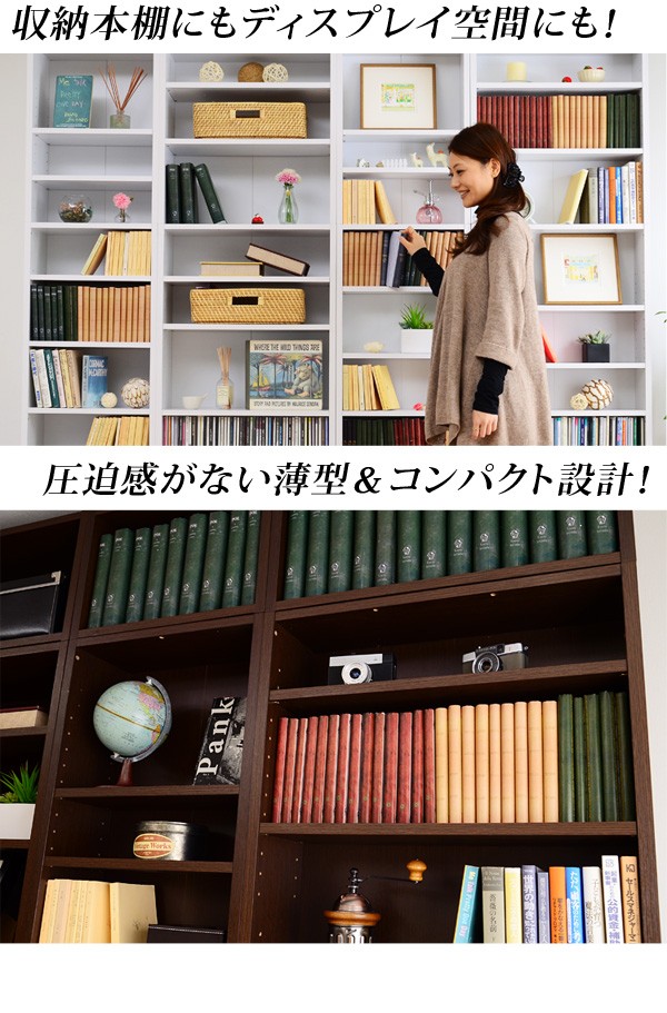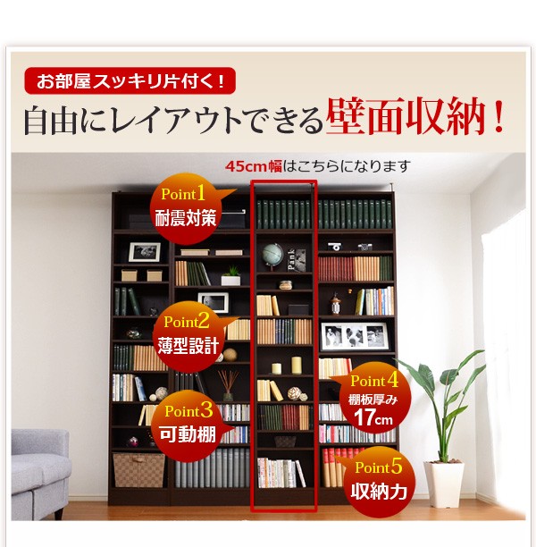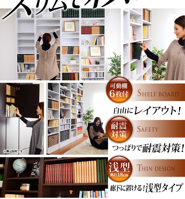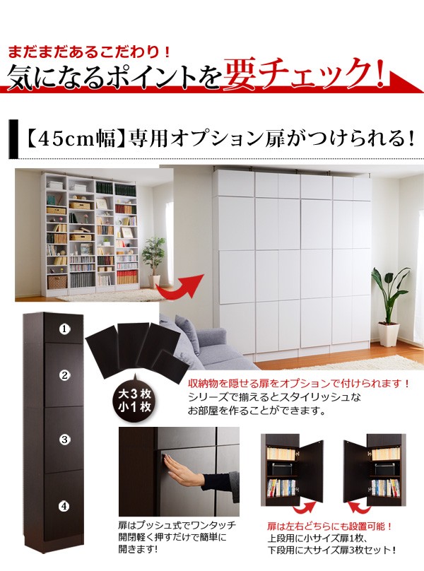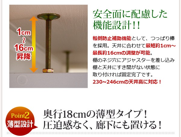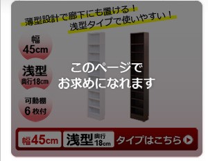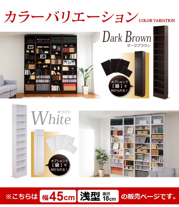 【商品について】※こちらのページは 【幅45・浅型タイプ】 のページです※■サイズ:全体外寸:(約)幅45x奥行18x高さ230cm(突っ張り棒で230~246cmの天井高さに対応可能)■カラー:ホワイト ダークブラウン■素材:構造部材:パーチクルボード、MDF表面加工:プリント化粧合板、ポリエステル化粧合板、PVC※可動棚6枚付き※背面下部は幅木避け加工■その他:・生産国:中国・お客様組み立て家具です   ※メーカー直送品、商品代引き不可