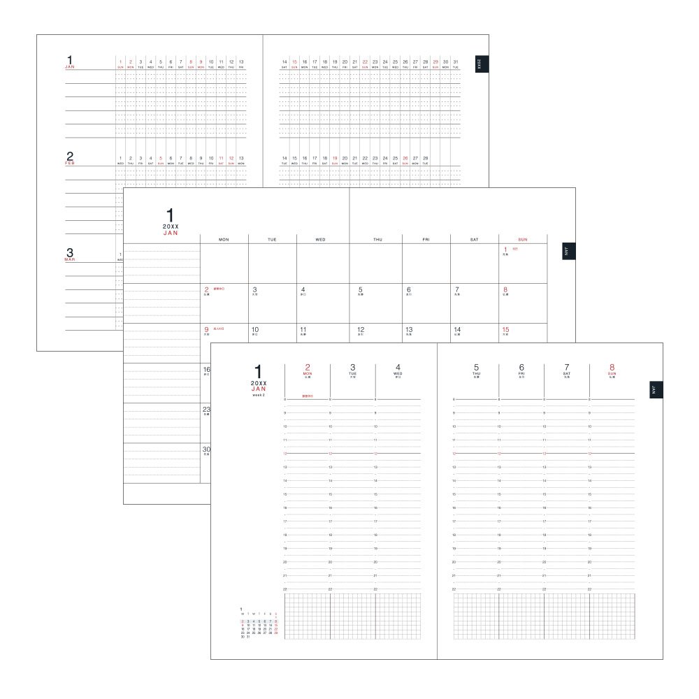 Weekly vertical type business diary that you can schedule the schedule by time series, with 3 month schedule easy to manage medium to long term plan, monthly block with memo field that can write weekly schedule.
