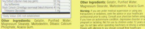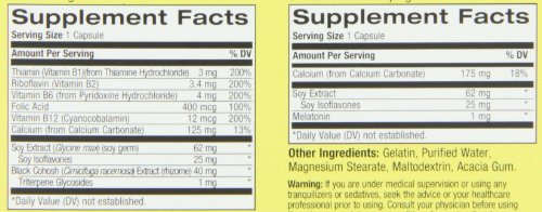 -. Feature : May reduce hot flashes, night sweats, mood swings, and other symp of menopause / Might support body's hormone balance among pre-menopausal women (in late 30s) / Includes soy, calcium, black cohosh, and many vitamins / Includes 30 capsules of A.M. formula and 30 capsules of P.M. formula / Please read all label information on delivery