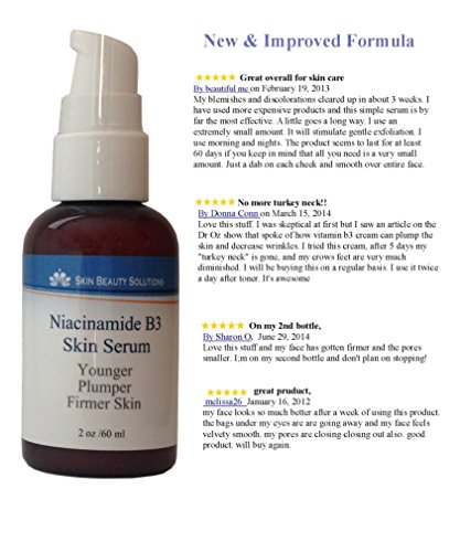 -. Binding : Misc. -. Brand : Skin Beauty Solutions -. EAN : 0816579010179 -. Feature : *****Problem Type: Acne, Dry skin and Wrinkles. *****Purpose: Skin Lightener, Hyperpigmentation, Age Spots, and Acne Spots ***** Skin Types: Combination, Mature, Oily skin, Dry skin, Sun Damaged Skin / Benefits Of Vitamin B3: ***Younger, Plumper, Firmer Skin ***Excellent Skin Lightening Agent ***Healthy Robust Skin / *** Fights Wrinkles and Lines ***Reduces Puffiness and Under Eye Circles ***Soothes Damaged Skin / *** Protects From Moisture Loss ***Refreshes and Purifies Skin ***Prevents Acne / We offer all our customers with a 100% satisfaction guarantee. If you are unsatisfied with any of our skin care products, you can always return or exchange for a full refund, No Questions Asked. Professionally produced, in the USA. Not tested on Animals. Cruelty Free. Non-comodegenic. -. Label : Skin Beauty Solutions -. Manufacturer : Skin Beauty Solutions -. MPN : 0816579010766, 0816579010179 -. PartNumber : 0816579010766, 0816579010179 -. ProductGroup : Beauty -. ProductTypeName : BEAUTY -. Publisher : Skin Beauty Solutions -. Studio : Skin Beauty Solutions -. Title : 2 oz - NIACINAMIDE 5% B3 Face Serum Advanced Formula with 5% Niacinamide Vitamin B3 for Younger, Plumper, Firmer Skin. Organic & Natural Base Serum -. UPC : 816579010766