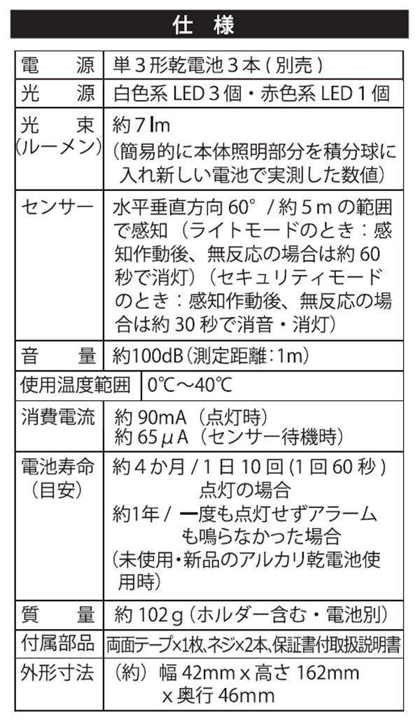 LEDセンサーライトとセキュリティーアラームが一つになりました。2つのモードを切り替えて使用できます。ライトモードでは暗い場所で人を感知して自動点灯。セキュリティーモードでは人に反応して自動点滅、大音量アラームが鳴ります。電池式なのでコンセントがなくても設置できます。 |