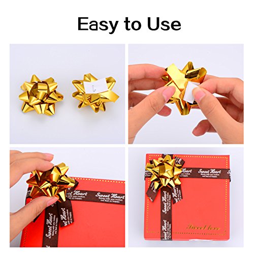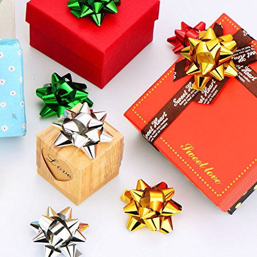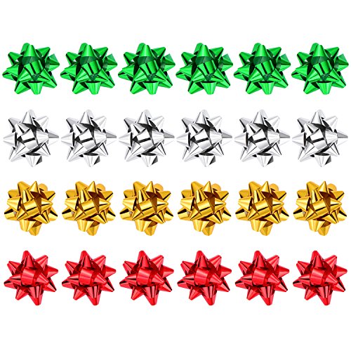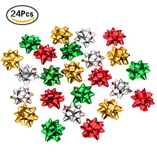Features: Easy to use: Pack in a clear plastic box (soft but sturdy), these bows will come completely and ready-to-use. With self-adhesive on the back of every bow, just peel off the back paper of the bow, and you are ready to go. Made of plastic material, metallic gift bows are sturdy, not easy to be out of shape. Holiday accessories: red, silvery, golden and green, these bows are in 4 different metallic colors, the combination of these 4 colors would surely add some festive glitter to your home. Glitter and shiny gift bows could actually create a festive spirit at Christmas, New Year, Thanksgiving and such holidays, you can wrap your gifts, crafts, cards with the bows, small bows are fine table decorations as well. Stick them to balloons, walls, furniture, cupboard and windows, as long as you want, the bows could be fine decorations for your home, office and school, etc. Specifications: Material: plastic Bows diameter: approx. 5 cm/ 1.97 inches Color: silvery, red, green and golden Quantity: 24 pieces Package includes: 24 x Gift bows Note: Do not put in mouth. 0