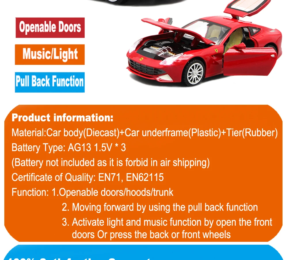 Functions :Light+Music+Pull Back Wheels+Openable doors