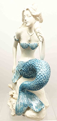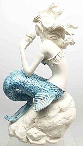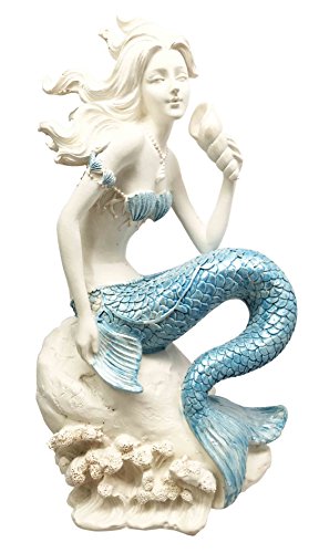 -. Title : Ocean Goddess Pretty Mermaid With Blue Tail Holding Conch Figurine Coastal Marine Statue Home Decor