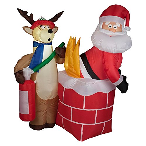 The inflatable Santa on fire features an abashed Santa Claus with his bottom in flames. He has clearly just come up from a delivery that went awry. Luckily, a Reindeer is available with a fireman's helmet and fire extinguisher. Kids will get a kick out of this blundering version of the man in the red suit. 4 ft. Light up air blown Santa on fire Christmas decoration is safe both inside and outside comes with a UL power supply takes mere seconds to Inflate itself after set up is easy to deflate and fold away in storage for next Christmas features a Santa on fire with a Reindeer putting out the flames lights up so it can be seen in the Evening.