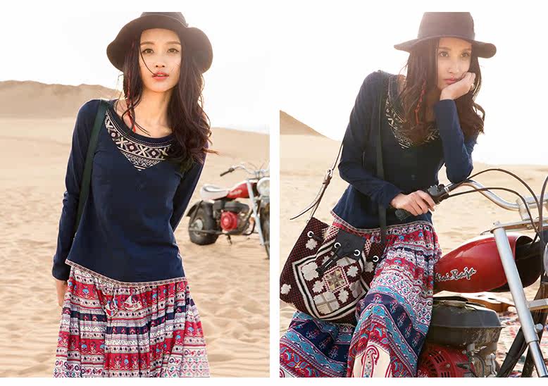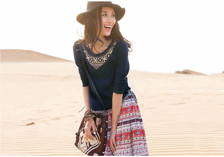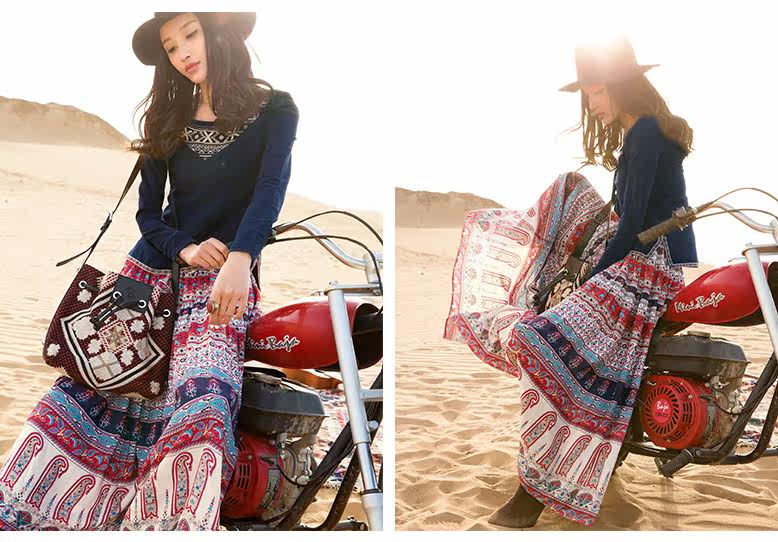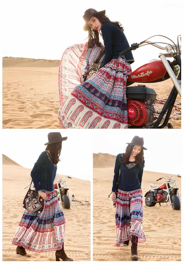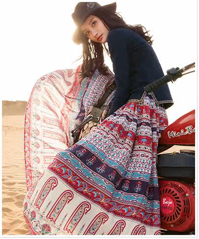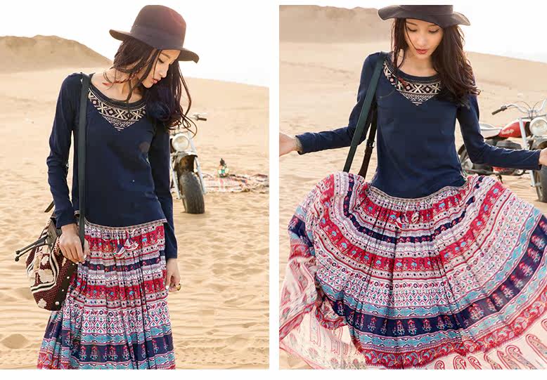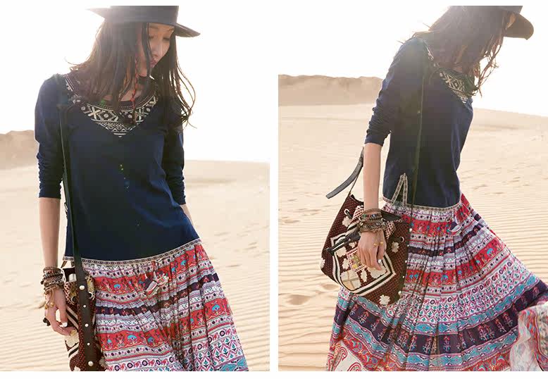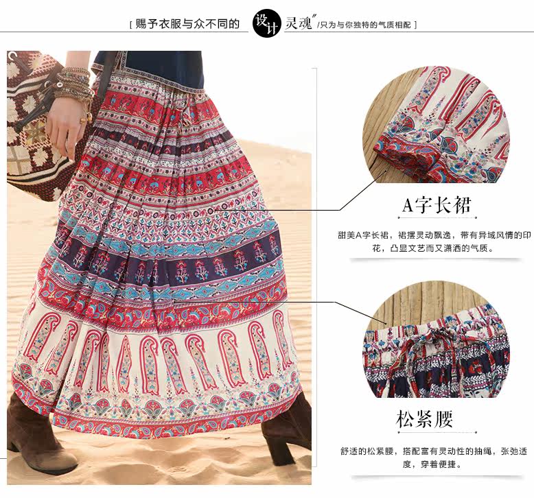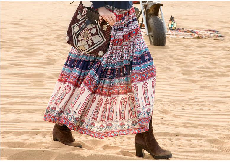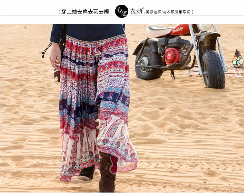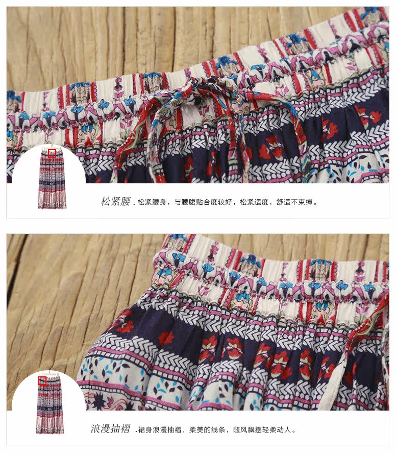 松紧腰印花抽褶半身长裙