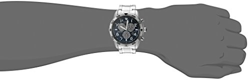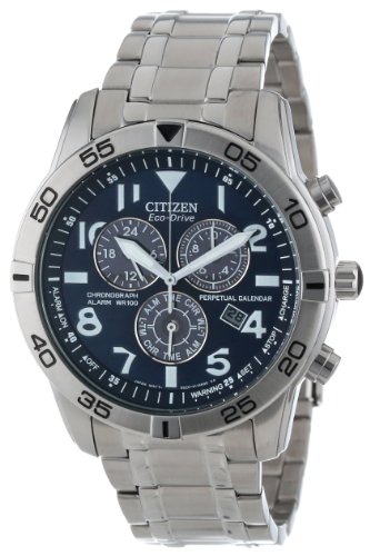 -. Feature : Stainless steel watch with chronograph subdials and link bracelet / Japanese quartz movement with analog display / Eco-drive technology is fueled by light and never needs a battery / Features protective mineral crystal dial window, perpetual calendar chronograph, date window, luminous indexes, stop watch, and fold-over clasp with hidden double push-button / Water resistant to 330 feet (100 M): suitable for snorkeling, as well as swimming, but not diving