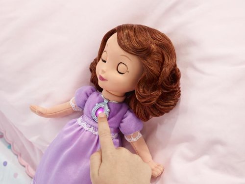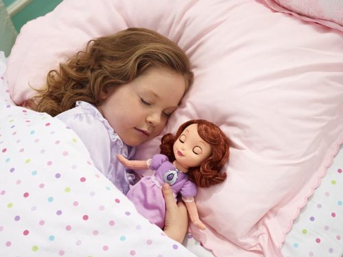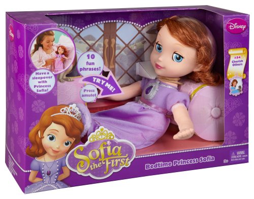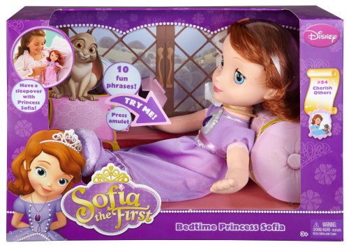 -. Binding : Toy -. Brand : Mattel -. EAN : 0692000172605 -. Feature : Based on the hit new animated series from Disney Junior, Sofia the First / Girls will love reenacting their favorite scenes from the show / Her soft body makes her the perfect cuddling companion / P.R.Incess Sofia doll says 10 playful phrases that will truly make girls feel like they're at a slumber party / Sofia's amulet glows when pressed - making bedtime extra bright and enchanting! -. IsAdultProduct : 0 -. Label : Mattel - Import (Wire Transfer) -. Manufacturer : Mattel - Import (Wire Transfer) -. Model : BGT60 -. MPN : BGT60 -. PackageQuantity : 1 -. PartNumber : BGT60 -. ProductGroup : Toy -. ProductTypeName : TOYS_AND_GAMES -. Publisher : Mattel - Import (Wire Transfer) -. ReleaseDate : 2013-11-01 -. Studio : Mattel - Import (Wire Transfer) -. Title : Disney Sofia the First Bedtime Doll -. UPC : 746775329495 -. Warranty : No Warranty