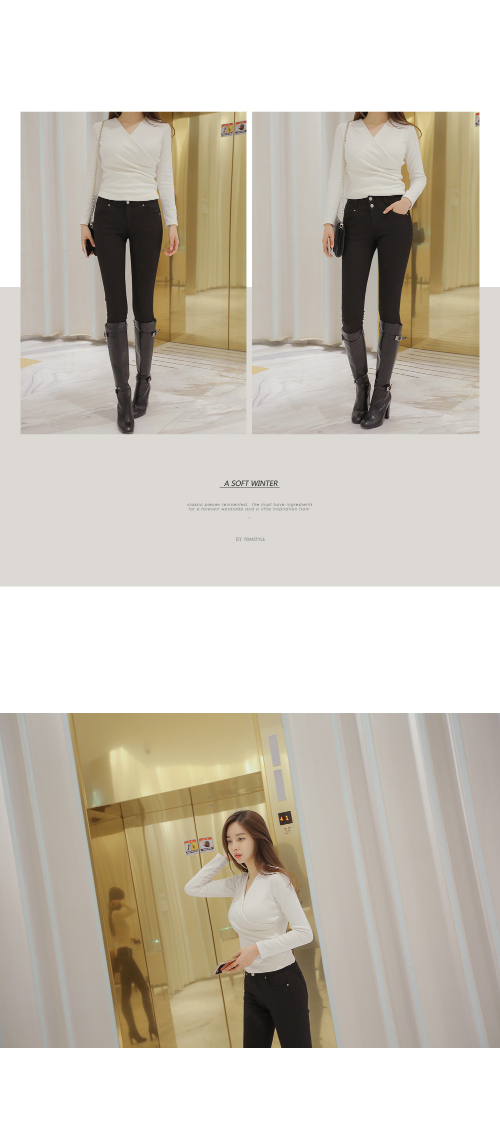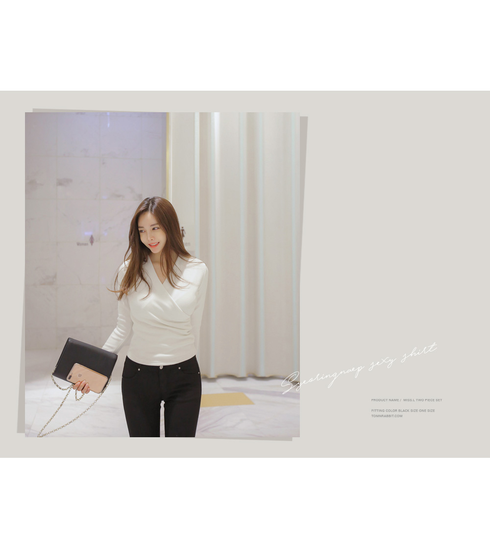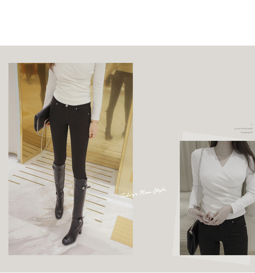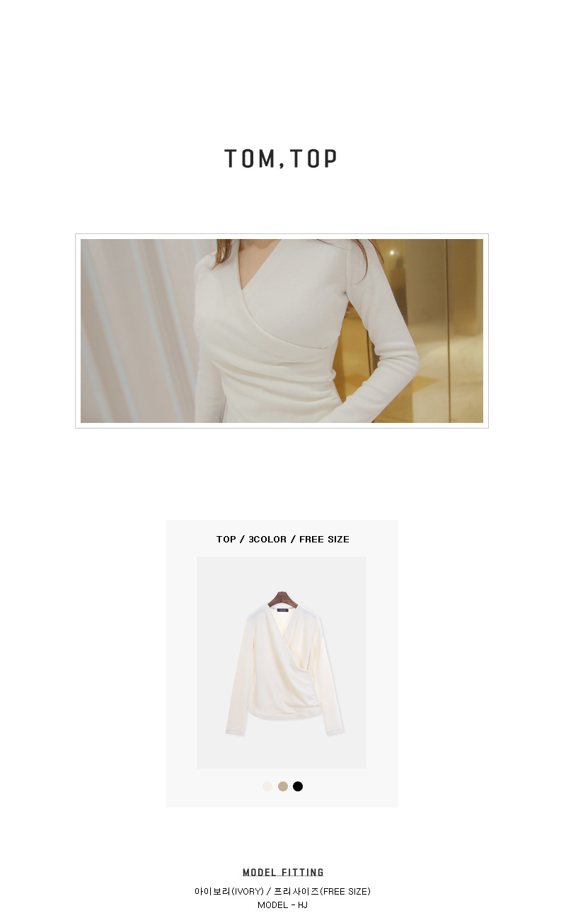 브이넥 으로 떨어지는 네크라인이 얼굴형을 갸름해 보이게 해 주는건 물론이며, 바디에 타잇-하게 핏되어져 몸매가 한층 더 슬림해 보이고 길어보이는 효과를 주는데요