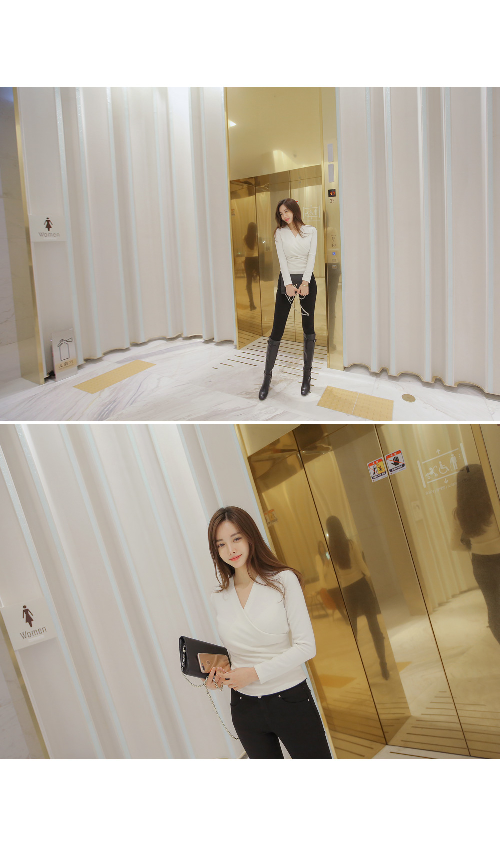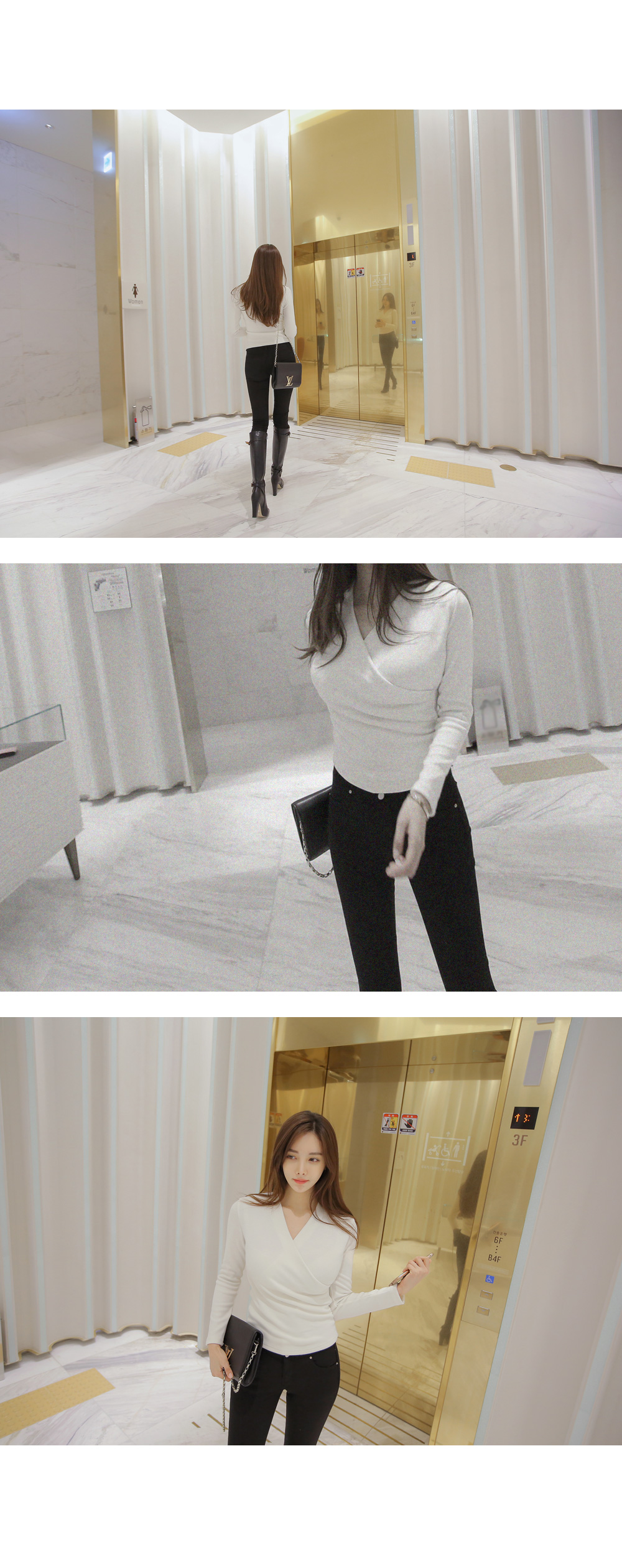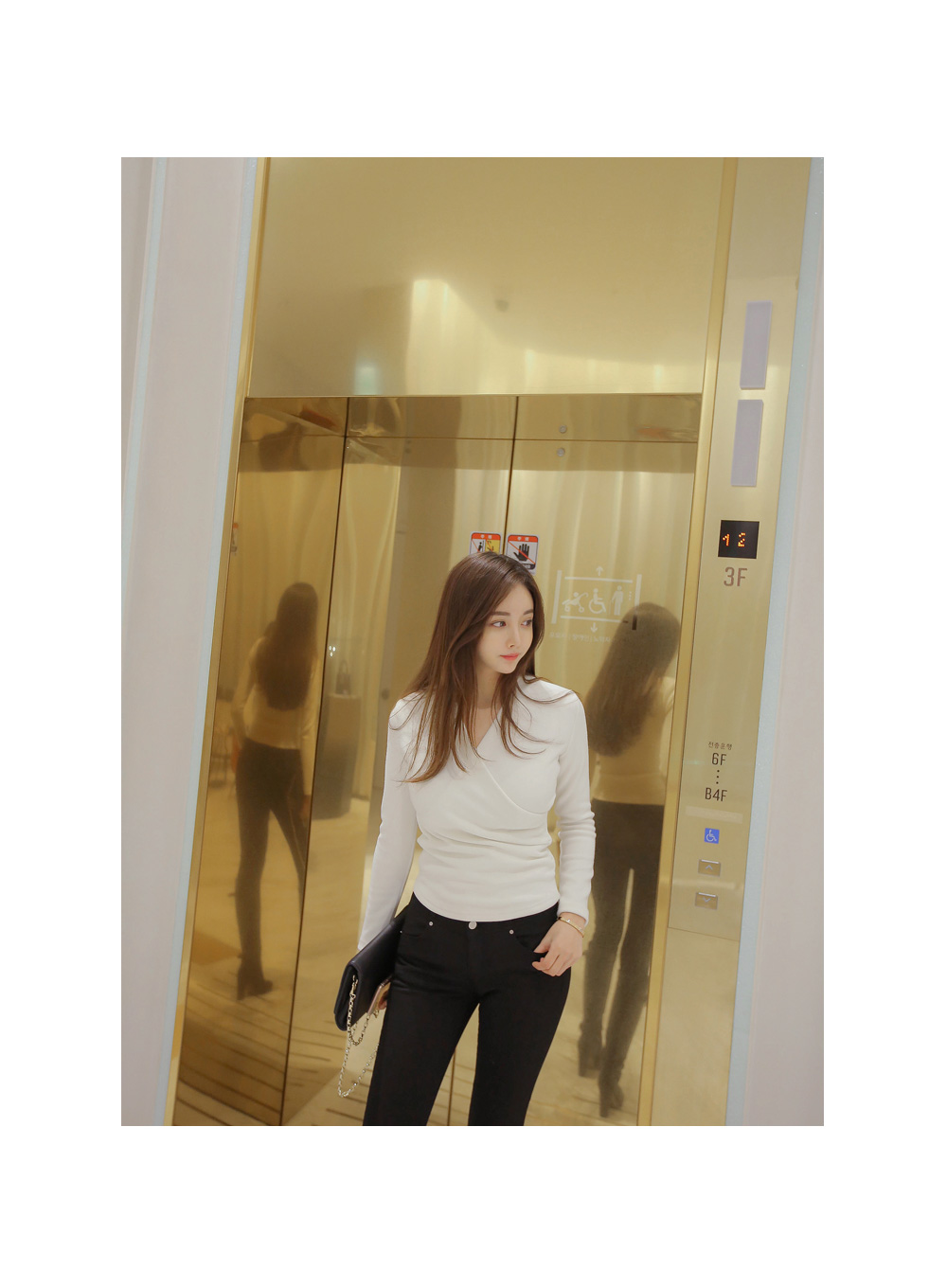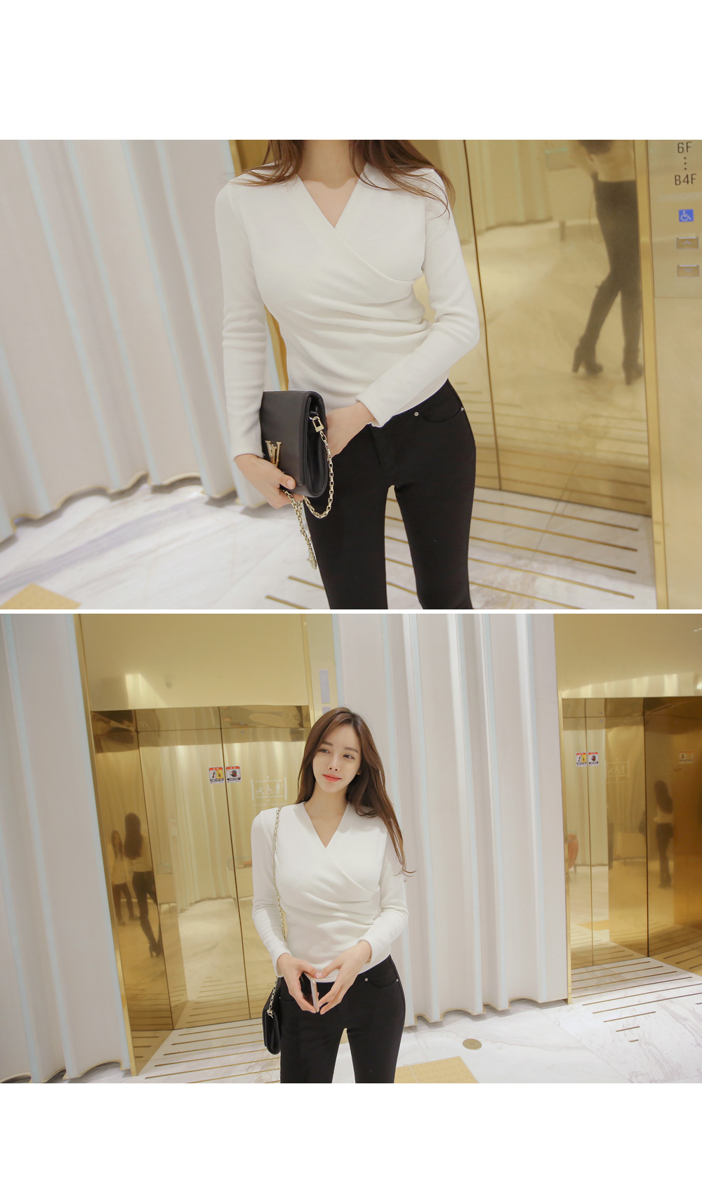 브이넥 으로 떨어지는 네크라인이 얼굴형을 갸름해 보이게 해 주는건 물론이며, 바디에 타잇-하게 핏되어져 몸매가 한층 더 슬림해 보이고 길어보이는 효과를 주는데요